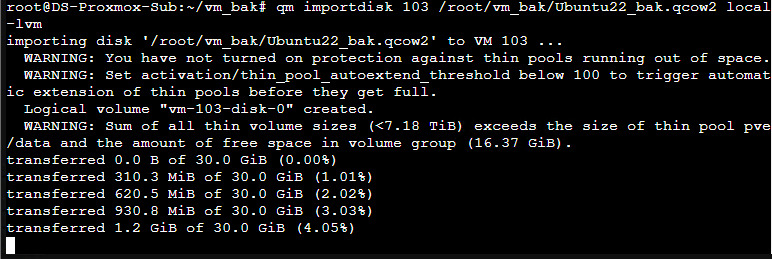 아래 방법을 통해 디스크의 논리적 위치를 확인하고 qcow2 파일로 떨궈서 보관하는방법을 진행하겠습니다. 보관장소는 NAS의 NFS를 사용하거나 외장하드를 사용하거나 편하신대로 하시면 되며 저같은경우 예를들기위해 작성하는거라 기본 셋팅된 lvm-local에서 진행하겠습니다.