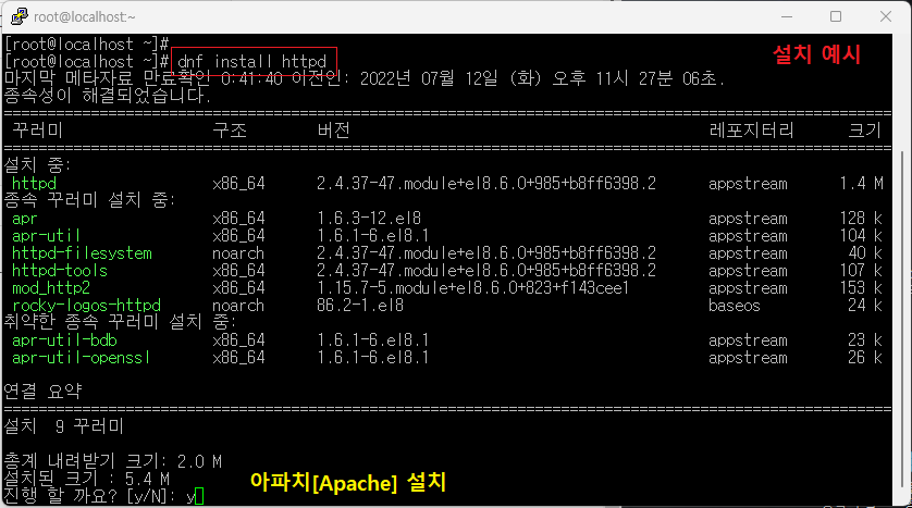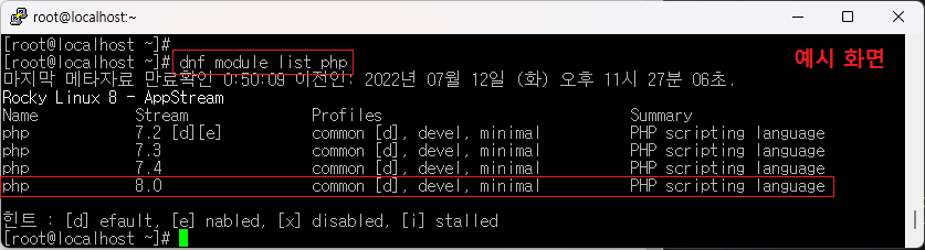 dnf: Rocky Linux는 기존 리눅스의 패키지 설치 관리 도구인 yum을 개선한 패키지 관리 도구로 dnf(Dandified YUM)를 사용을 할 수 있습니다. dnf는 RHEL/CentOS 8부터 정식 도입 되었으며, 기존 yum을 사용해도 되고, dnf(yum과 같은 용법)를 사용해도 됩니다.