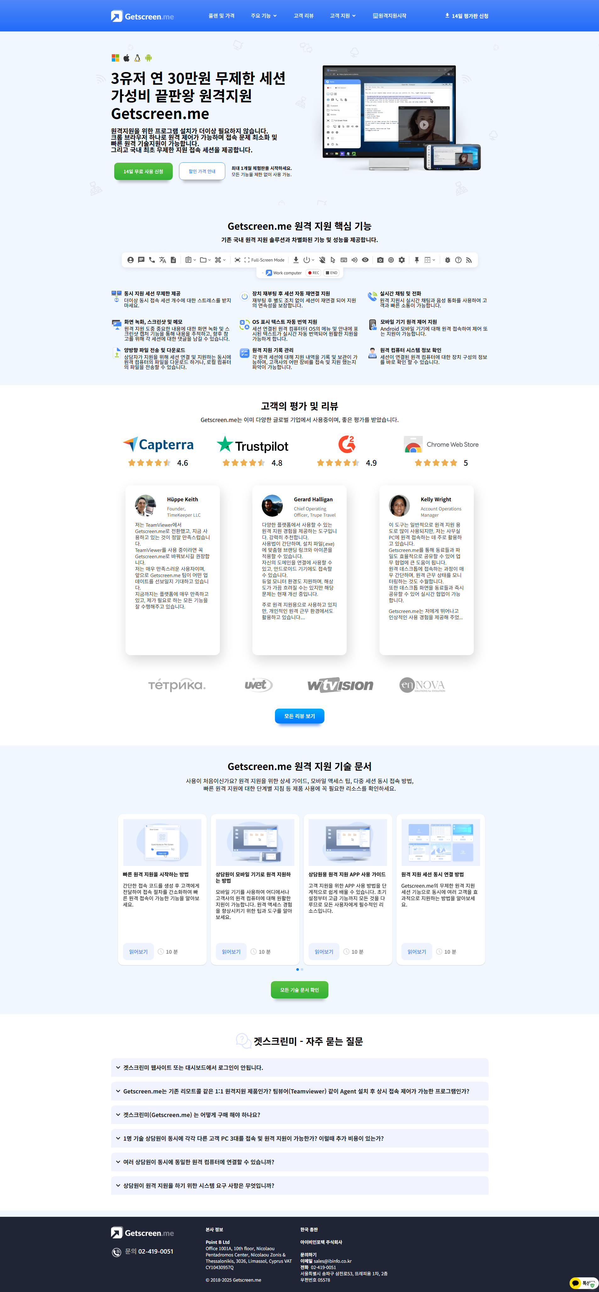 Getscreen.kr(국내명 ‘겟스크린미’)는 브라우저 기반의 원격지원 및 제어 솔루션으로, 설치 없이 즉시 1:1 지원이 가능한 ‘빠른 지원’ 기능, 그리고 에이전트 설치 후 지속 연결 가능한 ‘상시 원격 접속’ 기능을 통합 제공하는 올인원 플랫폼입니다