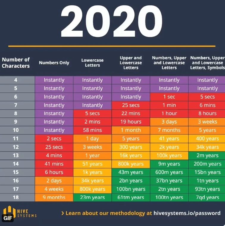 숫자와 함께 소문자와 대문자를 섞어 쓴다고 해도 4~6자로 구성된 비밀번호는 전혀 안전하지 않다. 그리고 조합에 기호를 추가하면 6자리 비밀번호라도 즉시 해독될 수 있습니다. 결론은 비밀번호가 길어야 하고 문자를 하나 더 추가하면 개인 데이터를 안전하게 보호하는 데 큰 차이를 만들 수 있다는 것입니다. 예를 들어, 소문자와 대문자, 숫자, 기호를 사용하면 보고서에 따르면 10자리 비밀번호를 5개월 안에 풀 수 있다고 합니다. 동일한 문자, 숫자 및 기호를 사용하면 11자의 암호를 해독하는 데 최대 34년이 걸립니다.
