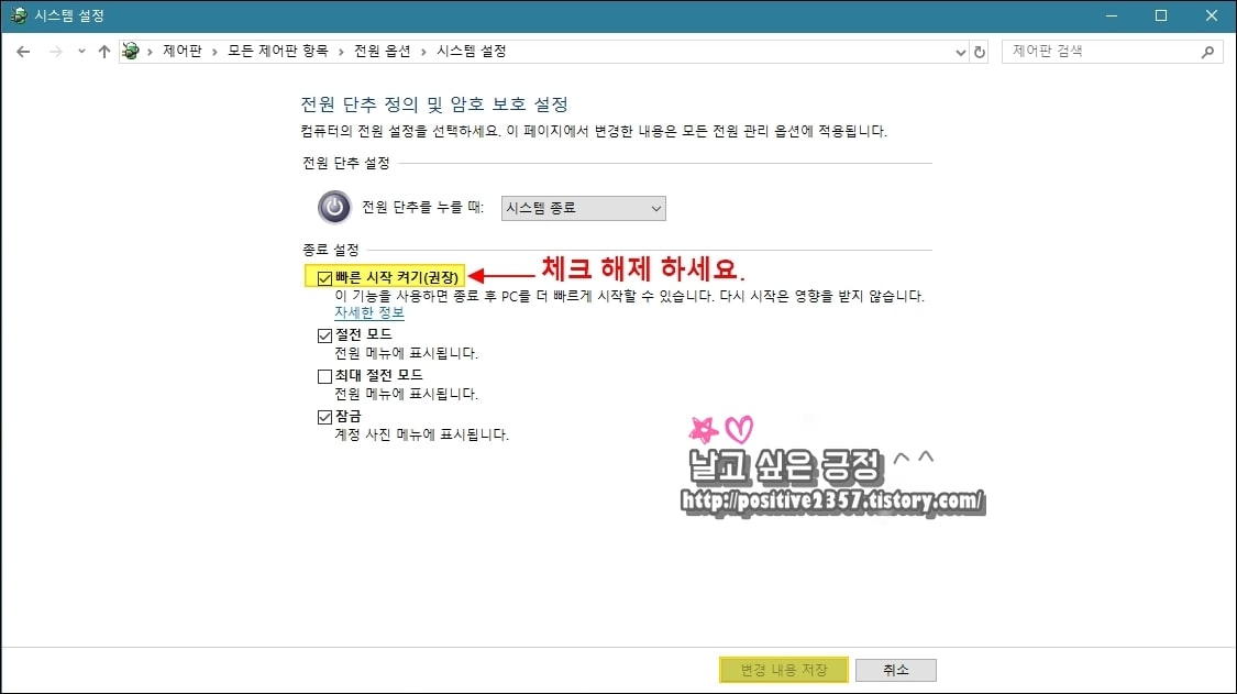 빠른 시작 켜기(권장)을 체크 해제 - 변경 내용 저장