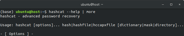 먼저 hashcat에서 지원되는 옵션을 확인하기 위해서는 다음 명령어를 실행하면 됩니다.