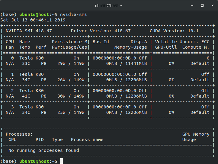 드라이버 설치 후 nvidia-smi 명령어를 실행하면 다음과 같이 GPU 목록을 확인 할 수 있습니다.