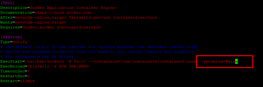 ExceStart 옵션 제일 마지막에 --iptables=false를 추가한 후 저장합니다.
