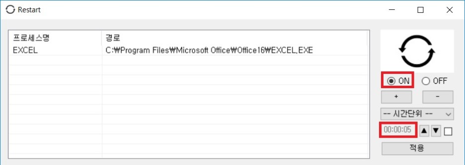 2. 'ON' 버튼을 클릭하면 정해진시간( 기본 설정 5초 )마다 리스트에 추가된 프로그램이 종료되었는지 확인하고 종료되어 있으면 리스트에 추가된 프로그램들을 다시 실행합니다.