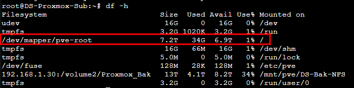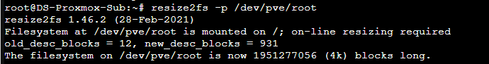 리사이즈가 완료되면 /dev/pve/root의 파일시스템도 리사이징 해주시면됩니다.