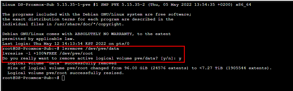 명령어 내용은 위에 캡쳐한 data를 지우고 그용량의 전체를 /dev/pve/root로 리사이즈 시켜준다는 의미입니다.