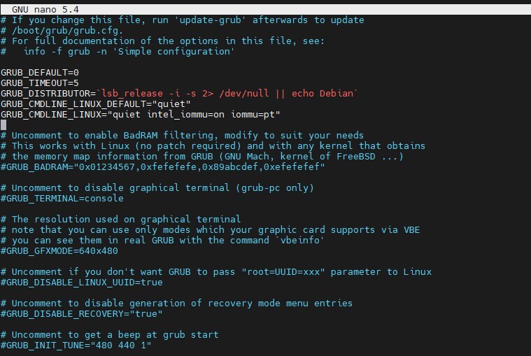 GRUB_CMDLINE_LINUX_DEFAULT="quiet intel_iommu=on"