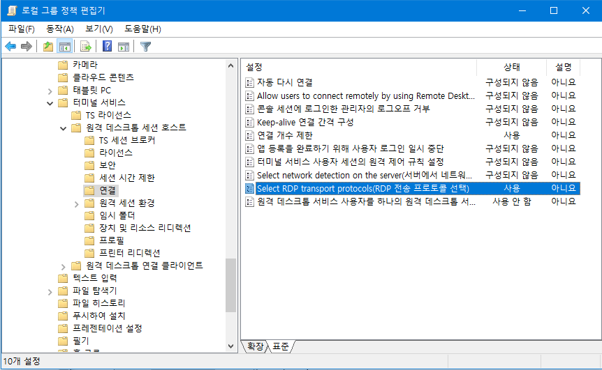 > 컴퓨터 구성 → 관리 템플릿 → Windows 구성 요소 → 터미널 서비스 → 원격 데스크톱 세션 호스트 → 연결 → Select RDP transport protocols(RDP 전송 프로토콜 선택) 을 "사용" 으로 선택 → "전송 유형 선택" 하단의 "Use only TCP(TCP만 사용)" 를 선택.