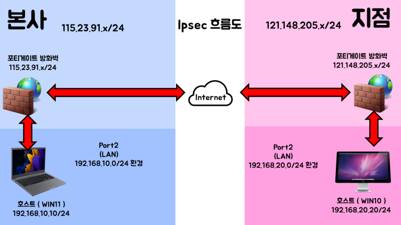115.23.91.x 아이피를 할당받은 포티게이트 본사( 본사라고 칭함 )의 내부 네트워크 영역 192.168.10.0/24에서 121.148.205.x 아이피를 할당받은 포티게이트 지점 ( 지점이라고 창함 )의 내부 네트워크 영역 192.168.20.0/24 간 Site to Site 통신을 하는 것을 목표로 두었습니다.