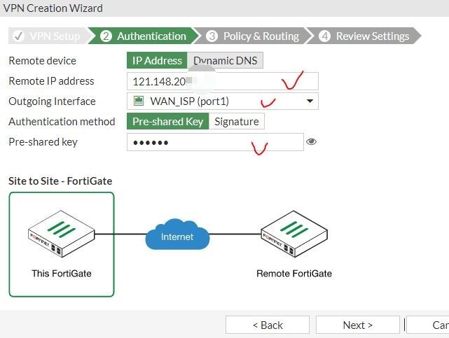 Site to Site 가 기본적이며, NAT 구성에서 No NAT between sites 인 경우에는 IPsec을 구성하는 포티게이트가 라우터등에 의해서 NAT의 적용을 받지 않는 경우여야 합니다.