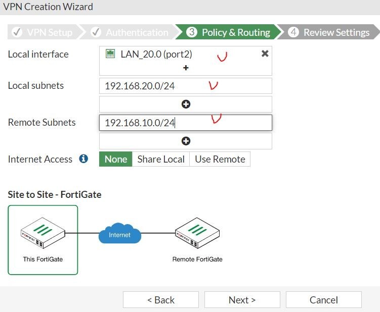 Local subnets은 현재 설정 중인 포티게이트의 LAN 내부 네트워크 영역 서브넷을 넣으면 되며,
