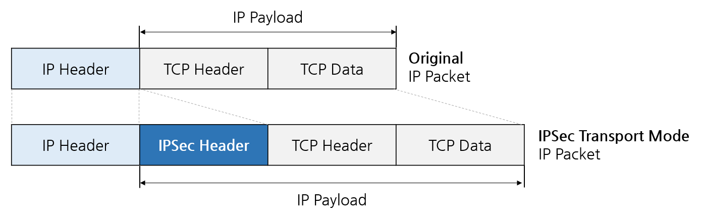 전송 모드는 IP 헤더를 제외한 IP 패킷 페이로드만을 보호하는 방식이다. 즉, IP 계층의 상위 프로토콜인 전송 계층의 데이터(좀 더 자세히는 TCP/UDP 헤더 + 데이터)만을 보호하는 것이다. 전송 모드의 패킷 모양과 본래 IP 패킷 모양을 비교해보면 IPSec 헤더가 추가되어 있는 것을 볼 수 있다.