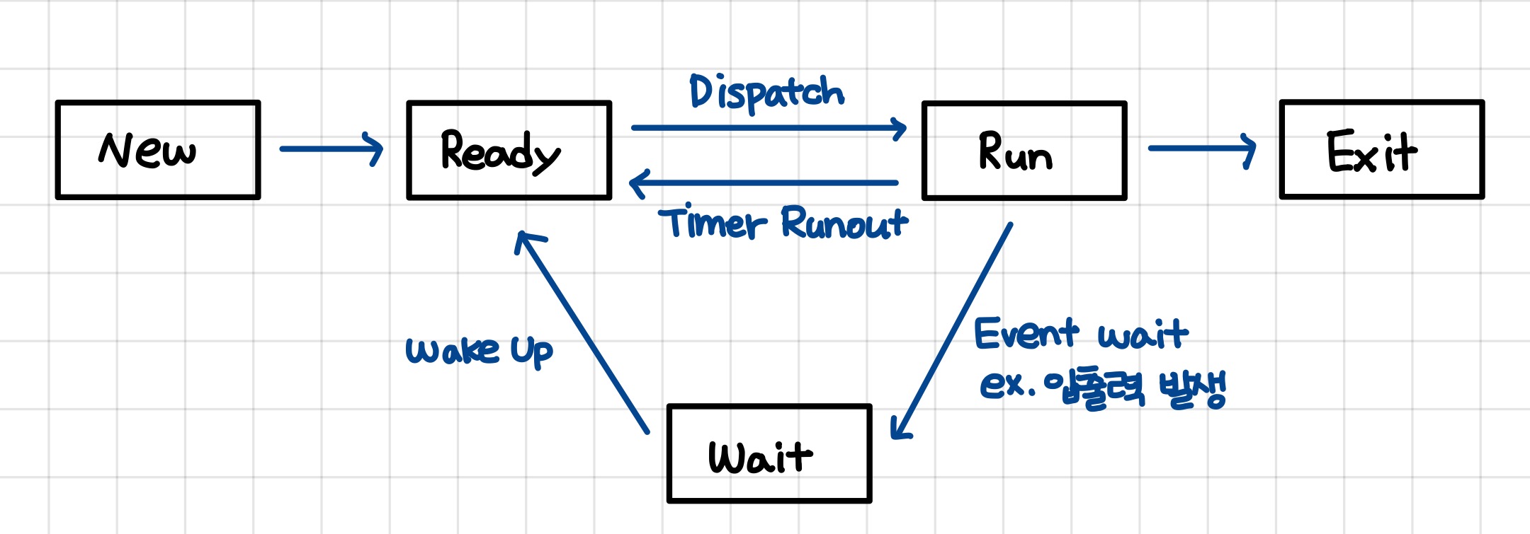 - 입출력 요구가 발생되어 현재 실행 중인 프로세스가 중단되고, 입출력 처리가 완료될 때까지 대기하고 있는 상태