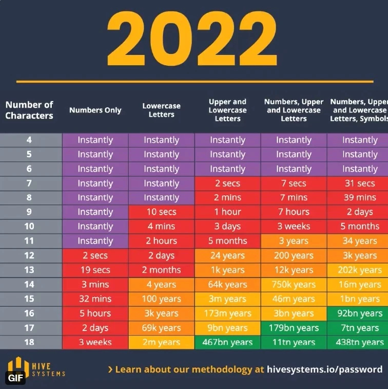 Hive는 온라인에서 사용되는 비밀번호가 숫자, 대문자, 소문자 및 기호를 혼합하여 사용하는 최소 8자 이상이어야 한다고 제안합니다. 당신의 마음이 날아가고 싶어? 앞서 언급한 숫자, 문자 및 기호 조합을 사용하는 18자 비밀번호는 평균적인 해커가 발견하는 데 최대 438조 년이 걸립니다.