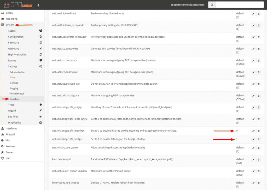 - net.link.bridge.pfil_member를 찾아 해당 설정을 Default 에서 0 으로 변경합니다 . 변경 사항 저장 및 적용