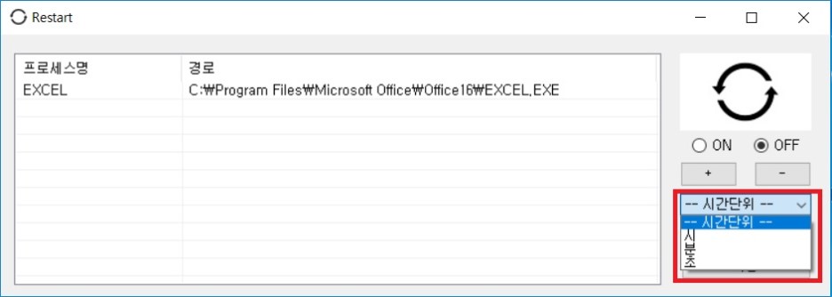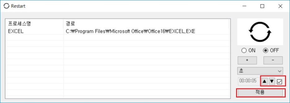 2. 'ON' 버튼을 클릭하면 정해진시간( 기본 설정 5초 )마다 리스트에 추가된 프로그램이 종료되었는지 확인하고 종료되어 있으면 리스트에 추가된 프로그램들을 다시 실행합니다.