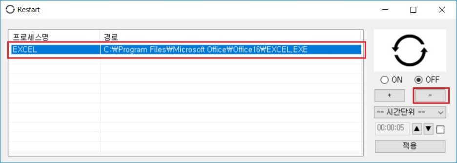 * "restart" 프로그램이 종료되고 컴퓨터가 부팅돼도 추가된 프로세스를 OFF상태로 변경하지 않으면 계속해서 실시간으로 감지하므로 감지할 필요가 없는 경우에는 OFF로 변경하셔야 더 이상 감지하지 않습니다.