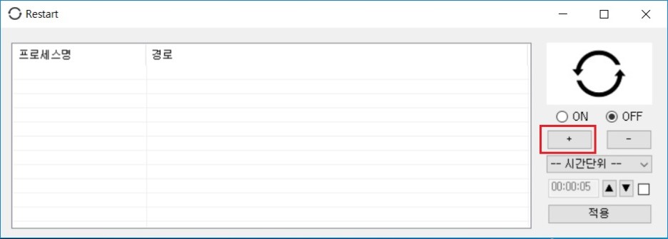 * .NET Framework 4.0 이상이 설치되어 있어야 실행할 수 있습니다. * 사용방법 * 1. '+' 버튼을 누르면 파일을 열수 있는 창이 나옵니다. 종료되면 자동으로 실행되게 하고싶은 프로그램 실행파일을 선