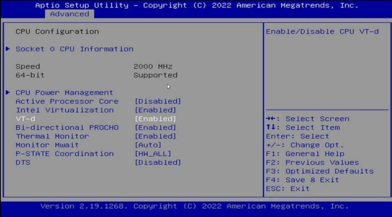 가장 먼저 해야 할 일은 시스템에서 IOMMU 기능을 켜는 것입니다. 이를 위해서는 CPU와 플랫폼이 해당 기능을 지원해야 합니다. 오늘날 대부분의 플랫폼은 IOMMU를 지원하지만 일부 이전 플랫폼은 지원하지 않습니다. Intel 플랫폼에서는 이를 "VT-d"라고 합니다. Intel Virtualization Technology for Directed I/O(VT-d)의 약자입니다.