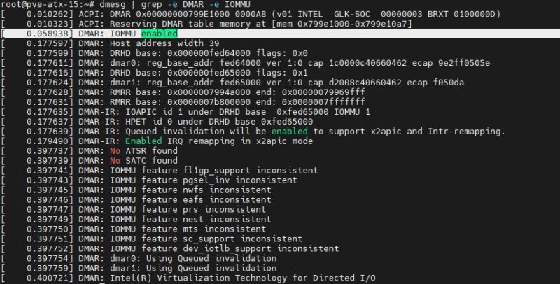 시스템, 가지고 있는 옵션 등에 따라 여기에서 많은 출력이 변경됩니다. 찾고 있는 것은 스크린샷 DMAR: IOMMU 활성화:에서 강조 표시된 줄입니다.