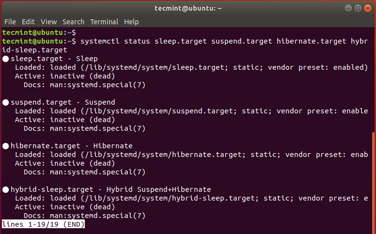 $ sudo systemctl status sleep.target suspend.target hibernate.target hybrid-sleep.target