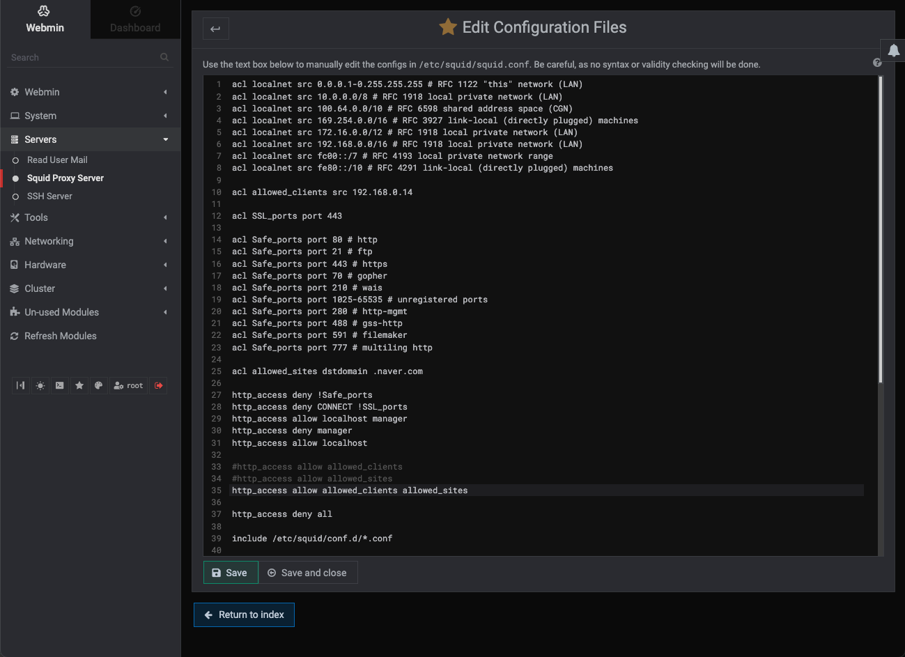 우분투에서 Squid 및 Webmin을 설치하는 방법 테스트 환경 $ lsb_release -d Description:Ubuntu 22.04.2 LTS Squid 설치 sudo apt-get update sudo apt-get install -y squid vim /etc/squid/squid.conf cat /etc/squid/squid.conf | egrep -v '^$|^#' $