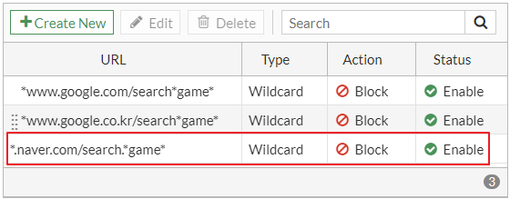 WebFIlter 기능을 이용하여 검색엔진에서 검색하는 특정 단어를 차단하는 방법이다. 예를 들어 "game"이라는 검색어를 차단하는 방법은 다음과 같다. 1. Web FIlter Profle에서 Static URL FIlter를 Wildcard 형식