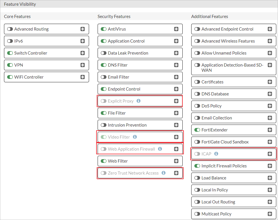 v7.2.4이상의 Lower-end 모델(40F, 60E, 61E, 60F, 61F, 80E, 81E)등 모델에서는 메모리 문제(2 GB 이하)로 Proxy를 포함한 일부 기능을 default로 disable 해 놓았다. 이전 버전에서는 Policy 설정 화면에서 Flow inspection