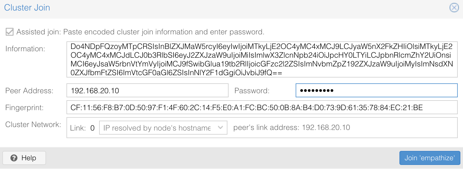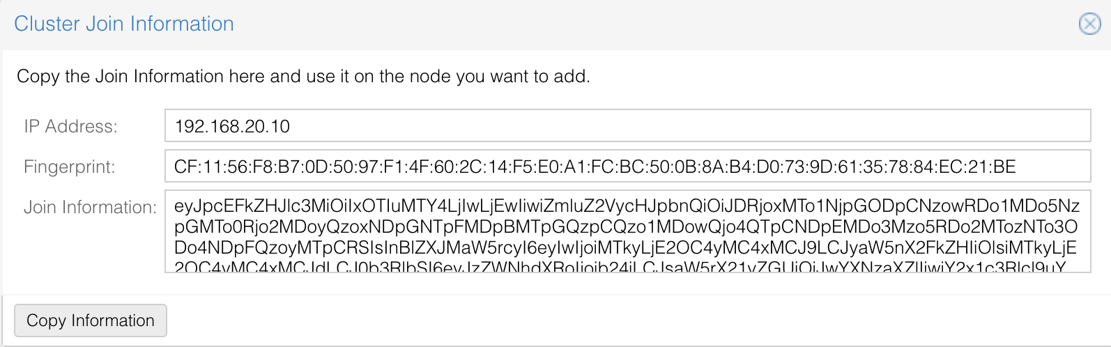 그럼 이 한대 마저도 클러스터 연결을 하겠습니다. Datacenter > Cluster > Join Information 을 눌러주면 아래와 같은 화면이 나옵니다.